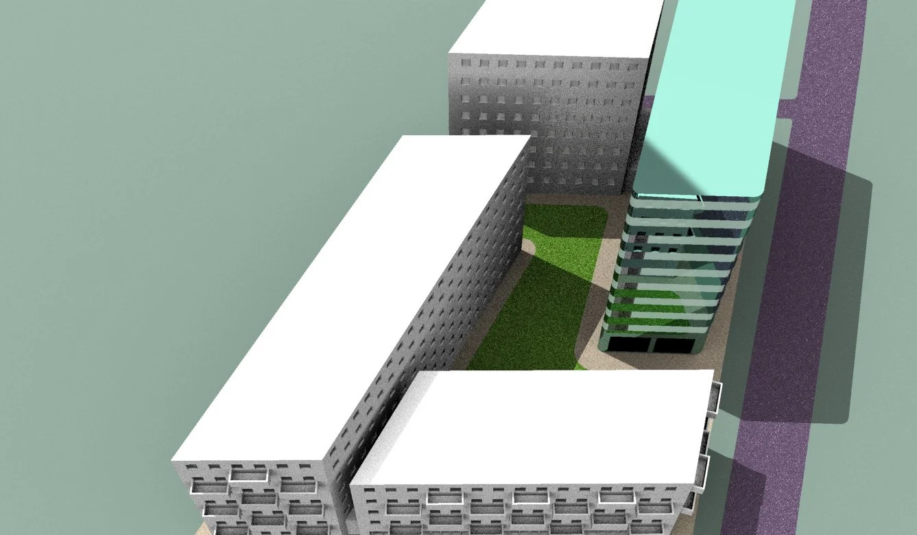 Skissförslaget utgjordes utav tre större lägenhetshus, ett högre lägenhets- och verksamhetshus samt tillhörande rekreationsytor.
